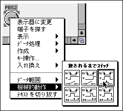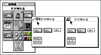 のアイコンが表示されるパレットへと変わりました。 フロントパネルをアクティブにすると,[制御器]のメニューが現れ,ダイアグラムをアクティブにすると[関数]のパレットが自動的に現れます。 また,パレットからそれぞれの制御器,関数を選択する際のサブメニューは,左上に「押しピン」がデザインされ,マウスのドラッグで「押しピン」が立ち,サブメニューを常時開いておくことができるようになりました。(図3)