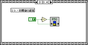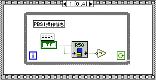 のように[R50]の出力を反転させてワイヤリングします。シーケンス0番で[R50]の出力はfalse"0"が保持されていますから,このシーケンスでは,フロントパネルのPBS1をクリックするまでループは実行を続けます。 PBS1をクリックすると,[R50]にtrue"1"が保持され,[not]で反転した出力が無限ループを終了させます。 本例の場合,@,Aのシーケンスは,フロントパネル上のスイッチ入力操作を待つためのダイアグラムとなっています。 実際の制御機械に使用するときは,デジタルI/Oインターフェースの入力信号待ちルーチンとして,また,計測機器とパソコン間で,GPIB等のシーケンスコマンドをやり取りする時には非常に有効なテクニックです。 Bシーケンス2番(図17)