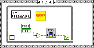 はブザーを鳴らし続けるダイアグラムです。押しボタンスイッチPBS2からの割り込みを処理しています。自己保持のVI[R50]を使用することで,当初のラダーチャートで計画した動作を実現させます。ブザーVIにはコネクタの指定をしませんでしたから,結線する必要はありません。関数パレット/VIを選択/メニューダイアログから選択し配置するだけです。 Dシーケンス4番(図20)