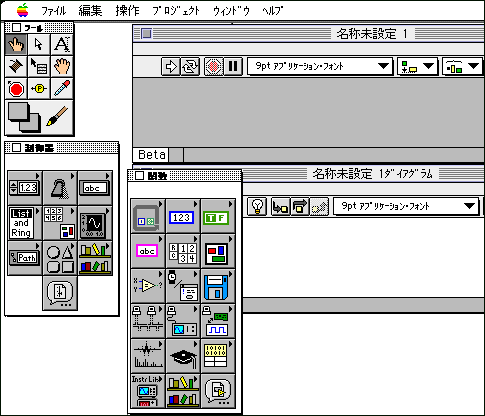 としてパワーアップして登場しました。 旧バージョンのLabVIEW3.xを使用して作成したアプリケーションVI(Virtual Instruments)は,そのままLabVIEW4上で問題なく実行することができますが,3.x以前のLabVIEWのアプリケーションは一度3.xのVIに変更した後で実行することになります。 Macintosh版については,完全にPowerPC対応LabVIEWとなりました。そのため,LabVIEW2.2以前に作成したCIN(コード・インターフェース・ノード)を用いたアプリケーションは,PowerPCに対応するようにCINの変更が必要になります。