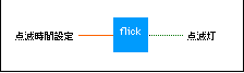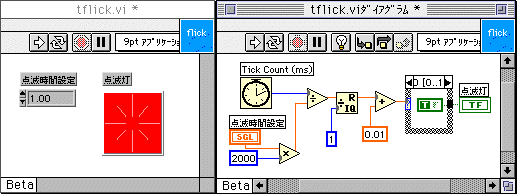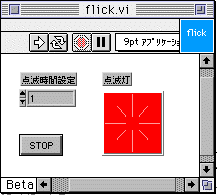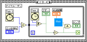 時間が経つと,スイッチのON/OFFを行うタイマの類似例としてフリッカー(繰り返し点滅)があります。 歩行者信号機の点滅,種々の警告灯等に使用しますが,タイマVI作成の時に使用したTick Count.viの応用となります。 フロントパネルには,[点滅時間設定]アイテム,[点滅等],[STOP]の3種を配置します。(図21) ダイアグラムは図22
