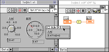 がプローブツールの実行例です。ダイヤグラム上のワイヤの途中でクリックすると,クリックした場所にプローブ番号が表示され,ワイヤを通過するデータがプローブウィンドウ{入力[1]}に表示されます。 もちろん,同時に複数のプローブを設定することができますし,削除は他のオブジェクトを削除する方法と全く同じです。 また,アプリケーションを保存して再実行すると設定したプローブはリセットされ消失しますから,プローブの削除に神経質になる必要はありません。