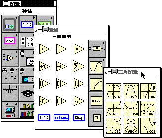 バージョンアップで強化されているのは,主にLabVIEWの操作とプログラミング時のデバッグ機能に関する部分です。Functionパレットにある組み込みVIや関数は,ほとんどがLabVIEW3.xと同じです。もともとLabVIEWの関数,組み込みVIは充実していて,LabVIEW2から3への移行時もわずかな変更があっただけです。 今回も関数パレット中のアイテムはLabVIEW3.xと同じで,特筆するような関数はありません。パレットの中にサブパレットを設けて入れ子構造になったので,当初のうちは必要なVIを探すのにとまどいを感じますが,慣れれば逆に便利です。(図7)