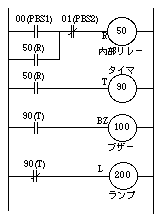 の様になります。このラダーチャートは,内部リレー(R50)の2個のリレースイッチ50(R)と2個のタイマスイッチを使用します。 @押しボタンスイッチPBS1を押すことで,(R50)のステップを自己保持(lock up)し,Aリレースイッチ50(R)によって,タイマT90がON,Bタイマスイッチ90(T)が動作し,Cランプ消灯とブザー鳴りという状態がPBS2を押して自己保持を解除するまで続きます。 押しボタンスイッチ,リレー,タイマのそれぞれの制御要素のもつスイッチには,制御要素の状態に合わせて動作するAスイッチとその逆の動作をするBスイッチとがあり,図中,がそれらのスイッチに相当します。